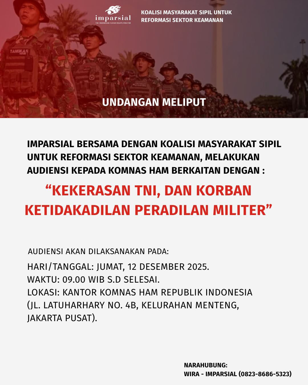 Karena itu, kami mengundang rekan-rekan media untuk dapat meliput audiensi koalisi masyarakat sipil untuk reformasi sektor keamanan untuk memulihkan prinsip negara hukum, memastikan bahwa setiap anggota TNI yang melalukan tindak pidana diproses melalui peradilan umum, serta menjamin hak korban untuk mendapatkan